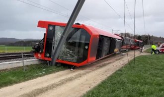 Olujni vetrovi duvali su danas u Švajcarskoj i moguće je da su uzrokovali nesreću, objavila je kompanija koja upravlja regionalnom železnicom RBS U prvom izletanju "zadnji deo voza prevrnuo se na desnu stranu", navela je portparolka.