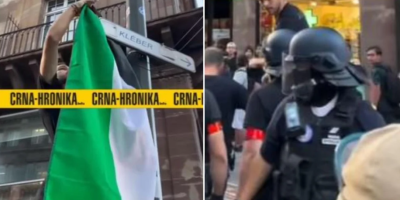 Čovek po imenu Husein zvani Huso popeo se na metalni stub i pokušao da postavi zastavu Palestine na znak. U tom trenutku policajci su mu nasilno oduzeli zastavu, i odmah ga lišili slobode.