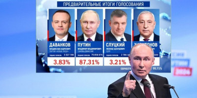 Vladimir Putin ubedljivo vodi na izborima za predsednika Rusije sa 87,3 odsto glasova. Nikolaj Haritonov ima 4,31 odsto glasova, Leonid Slucki – 3,21 odsto, a Vladislav Davankov 3,83 odsto glasova, saopštila je Centralna izborna komisija Rusije na osnovu obrađenih 99,83 glasačkih listića.