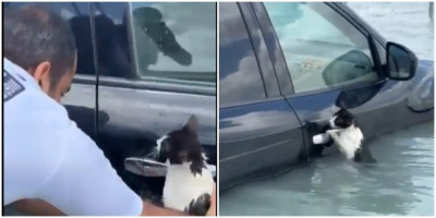 Automobili su bili potopljeni, pa je sreća što je mačka uspela da se zadrži i preživi do dolaska spasilaca.
