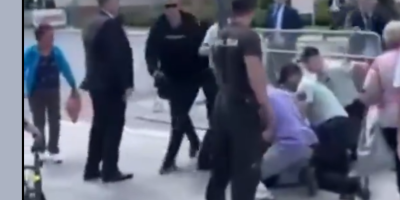 Na snimku objavljenom na društvenim mrežama vidi se kako je policija napadača oborila na zemlju.