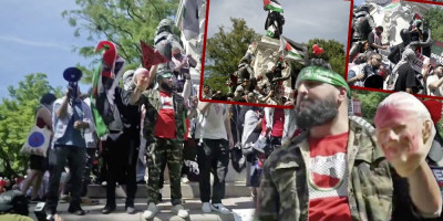 Muškarac sa zelenim povezom na glavi sa natpisom "Hamas" držao je krvavu masku predsednika Džoa Bajdena tokom antiizraelskog protesta ispred Bele kuće u subotu.