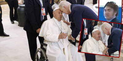 Bajden se sa papom koga su dovezli u kolicima pozdravio na veoma neobičan način. Američki lider se sagnuo i na očigledno iznenađenje pape, naslonio svoje čelo na njegovo. Papa se pravio kao da je sve u redu, dok se primećuje da mu nije nimalo prijatno.