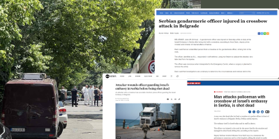 Britanski Gardijan navodi da je "napadač iz samostrela ubijen nakon što je ispalio strelu u stražara izraelske ambasade" i prenosi izjave srpskih zvaničnika.