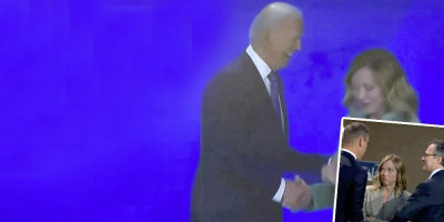 Meloni was seen arching her back away from Biden as he continued to lean in.