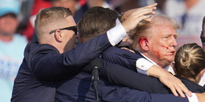 Čuje se nekoliko glasova agenata tajne službe - jedan kaže "gore!" drugi „stepenice su spremne, stepenice su spremne". Čuje se i Tramp, ali njegove reči nisu jasne. Još agenata ulazi na scenu, neki drže automatske puške. Trampove pristalice u pozadini izgledaju šokirano, dok neki snimaju telefonima.