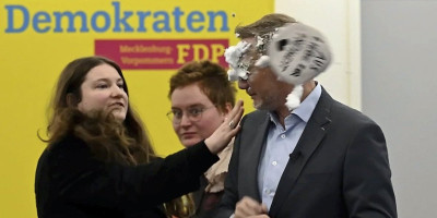Mlada žena bacila je "lažnu tortu" na lidera nemačke stranke FDP-a, Kristijana Lindnera, tokom njegovog nastupa na predizbornoj kampanji u Grajfsvaldu (Meklenburg-Zapadna Pomeranija).