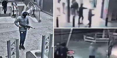 Na snimku se kako dvojica maskiranih muškaraca naoružana automatskim puškama kalašnjikov rano jutros otvaraju vatru na nekoga kod ulaza u metro stanicu, nakon čega beže u nju.