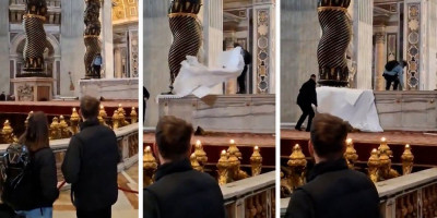 Na snimku, koji kruži na društvenim mrežama, vidi se kako neidentifikovani vandal juče uveče nogom udara šest zlatnih kandelabra sa oltara bazilike Svetog Petra. Divljanje je nastavio skačući po belom platnu pre nego što je povukao tkaninu na pod.