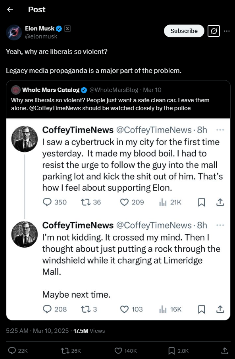 Nedugo nakon što je Džons objavio vest na platformi X (bivšem Tviteru), viralno se proširio tvit Ilona Maska u kojem je govorio o "nasilnim liberalima".