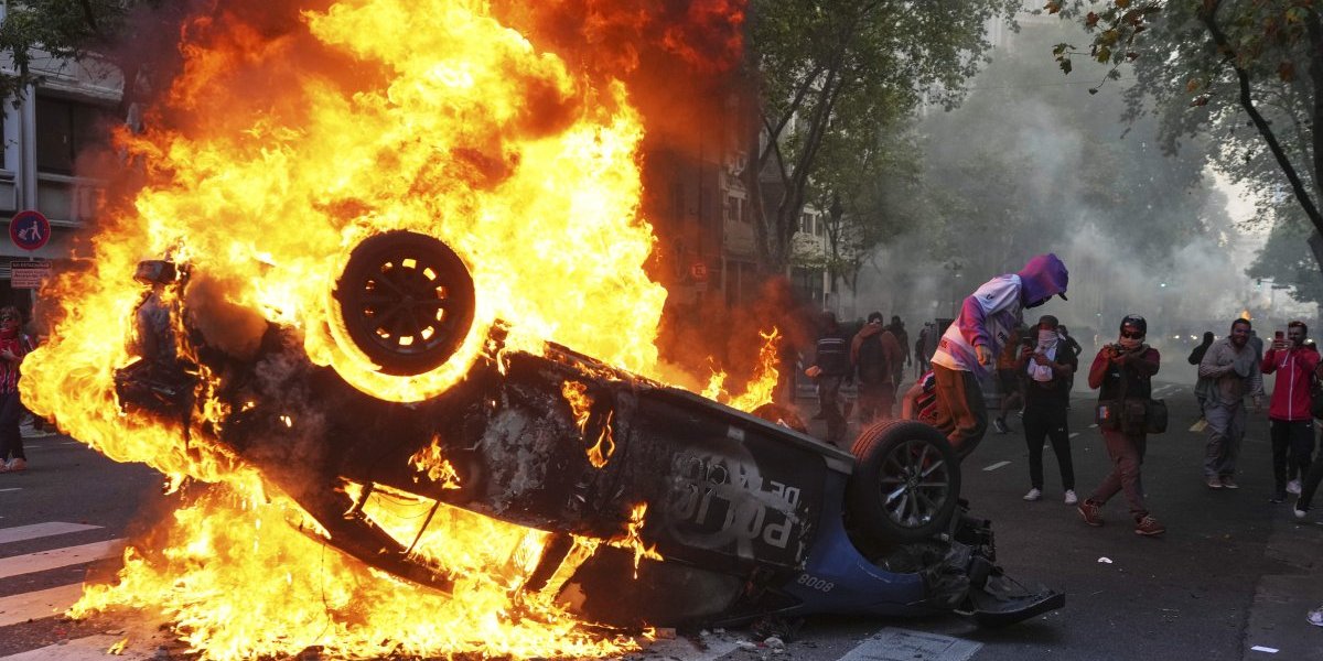 Ispred Kongresnog trga prevrnut je i zapaljen patrolni automobil gradske policije, kao i desetine kontejnera za smeće.