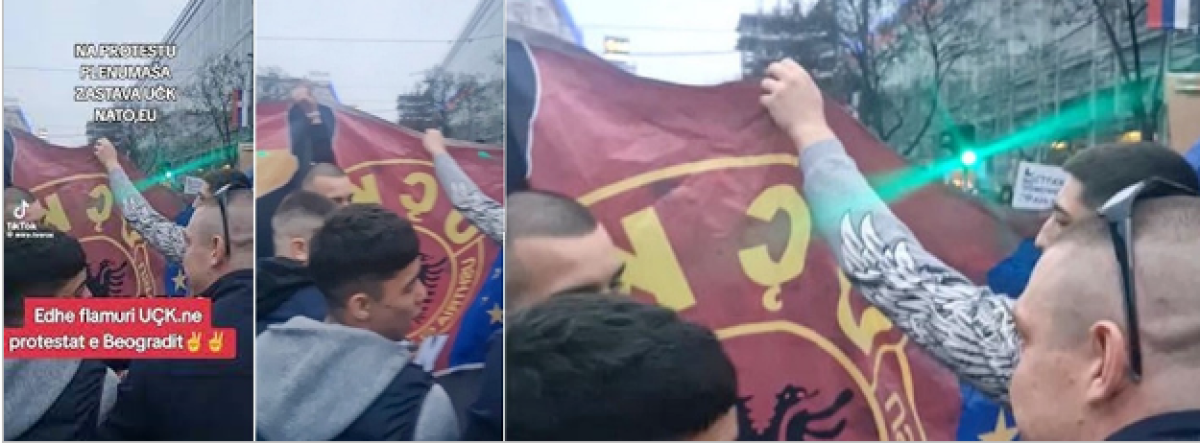 15.3.2025.Beograd. Pripadnici opozicije i njihovi studenti su, na Terazijama, krajnje skaredno i odvratno, u po bela dana, razvili zastave terorističke organizacije UČK i zločinačkog NATO, koji nas je tako bezumno ubijao.