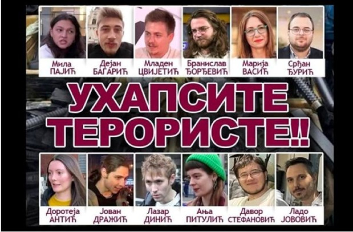 14.3.2025. Novi Sad. Pripadnici MUP, Službe za suzbijanje kriminala i Službe za borbu protiv terorizma UKP, po nalogu VJT u Novom Sadu, uhapsili su 6 osoba zbog postojanja osnova sumnje da su izvršili krivično delo pripremanje dela protiv ustavnog uređenja i bezbednosti Srbije, u vezi sa krivičnim delom pozivanje na nasilnu promenu ustavnog uređenja. Uhapšeni su: 1. Lazar Dinić (2001) član grupe “Stav”, 2. Mladen Cvijetić (1999) član PSG, 3. Davor Stefanović (2000) član PSG, 4. Marija Vasić (1975) član PSG, 5. Lado Jovović (1981) član PSG i 6. Srđan Đurić (1998) član PSG. Šest osoba je u bekstvu u Dubrovniku u Hrvatskoj: 1.Mila Pajić, 2.Branislav Đorđević, 3.Doroteja Antić, 4.Dejan Bagarić, 5.Anja Pitulić i 6.Jovan Dražić.