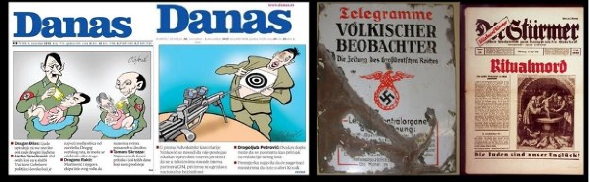 Nasilje opozicije u poslednjih pet meseci je istovetno nasilju nemačkih nacista nad Jevrejima 30-tih godina. Tada su nacisti napadali Jevreje na ulicama, kamenovali ih, gađali jajima, napadali lokale Jevreja, vršili nacističku propaganda u medijima, jurili Jevreje po ulicama. Potom su nacisti doneli antisemitske zakone, i na kraju su izvršili genocid - holokaust nad 10 miliona Jevreja. Nacisti su imali antisemitska glasila „Folkišer beobahter“ („Narodni posmatrač“) i „Šturmer“(„Jurišnik“), i udarni elektronski medij državni nacistički radio.