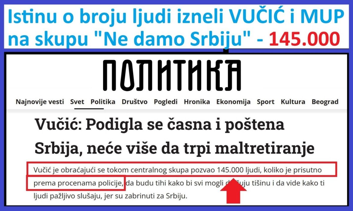 Da ponovim, po proceni MUP, skupu "Ne damo Srbiju2 je prisustvovalo 145.000 ljudi. To je najmasovniji skup u istoriji Srbije. Procene MUP su uvek tačne. Procene Arhiva su uvek lažne, a procene opozicije su uvek drastično lažne.