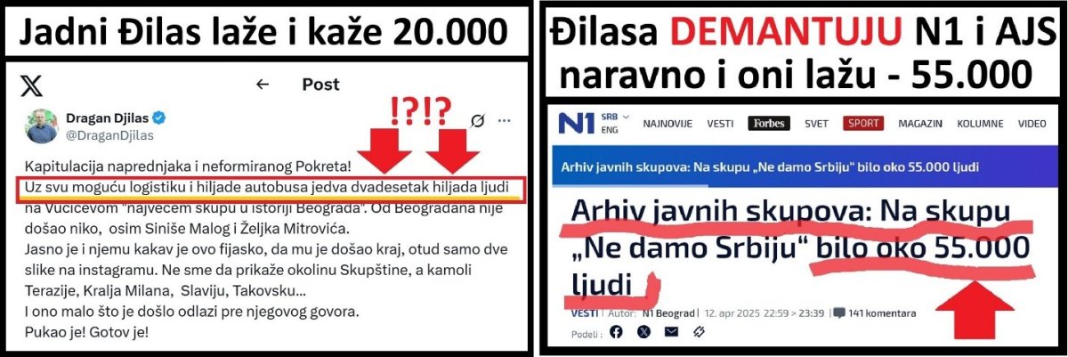 Najgori šamar i udarac Đilasu, došao je iz sestrinskog medija N1 i od Arhiva javnih skupova. Portal N1 je u 22:59 objavio tekst pod naslovom: "Arhiv javnih skupova: Na skupu "Ne damo Srbiju" bilo oko 55.000 ljudi". Taj tekst demantuje Đilasove laži o "jedva 20.000 ljudi". Težak udarac Đilasu. N1 i Arhiv tvrde da je Đilas masno slagao, dva i po puta i da nije bilo 20.000 ljudi već 55.000! Naravno, i Arhiv i N1 takođe lažu, kao i uvek. Kao i uvek, lažu mnogo manje nego Đilas i ostala opozicija. Princip je sledeći. Opozicija desetostruko uvećava ili umanjuje brojeve, a N1 i Arhiv, "samo2 između dva do tri puta, kako kad. Osim što Đilas i NovaS mnogo lažu, a N1 i Arhiv manje lažu, konstatujem da su nesložni u laži. Pazite, NovaS i N1 imaju istog vlasnika, to su sestrinski mediji. Drugo, i Đilas je jedan od onih koji finansiraju Arhiv javnih skupova, koji čine trojica nestručnih tipova iz opozicije. Ovo je još jedan dokaz koliko su posvađani i nesložni i opozicija i njeni mediji N1 i NovaS. Oni jedni drugima oči vade, ko vrane, tamo se ne zna ko pije a ko plaća. Nesložni su čak i u laganju. Dva medija, dva oka u istoj glavi, N1 i NovaS, su dva razroka, vrljava oka. Jedno gleda levo, drugo gleda desno.