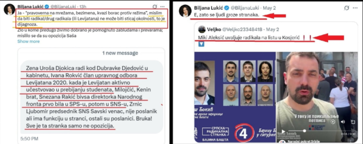 U ovom trenutku traju sukobi u opoziciji, u kojima ljudi bliski Draganu Đilasu, napadaju ljude iz Aleksićeve stranke NPS, i optužuju ih da su lažna opozicija. Tako Đilasova novinarka, Biljana Lukić, predstavljajući se kao „pravoverna“; optužuje niz funkcionera stranke Miroslava Aleksića, da kriju da su bili u SRS, u Levijatanu, u SNS, u SPS itd. Ona optužuje Uroša Đokića - potpredsednika NPS, da je bio funkcioner SRS i da to krije. Biljana Lukić optužuje suprugu Uroša Đokića, Jelenu Đokić da je sada funkcionerka u Ministarstvu rudarstva i energetike, i da to krije. Biljana Lukić optužuje Ivanu Rokvić - potpredsednicu NPS, da je bila liderka „Levijatana“, i da to krije. Uroš Đokić besmilsleno negira da je bio funkcioner SRS, iako za to postoje jasni dokazi. Ivana Rokvić,takođe besmisleno negira da je bila liderka Levijatana, iako za to postoje jasni dokazi.