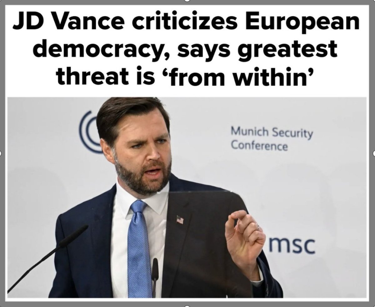 Džej Di Vens je rekao: „Jedna od stvari o kojoj sam danas želeo da pričam su, naravno, naše zajedničke vrednosti. Ono o čemu brinem je pretnja iznutra. Uzmicanje Evrope od nekih od njenih najosnovnijih vrednosti. Kako se ispostavilo, ne možete naterati ljude šta da misle, šta da osećaju ili u šta da veruju. I nažalost, kada pogledam Evropu danas, ponekad nije baš jasno šta se dogodilo nekima od pobednika u Hladnom ratu. Gledam u Brisel, gde su komesari Evropske komisije upozorili građane da nameravaju da ugase društvene mreže u vreme građanskih nemira: u trenutku kada uoče ono što su ocenili kao „sadržaj mržnje“.