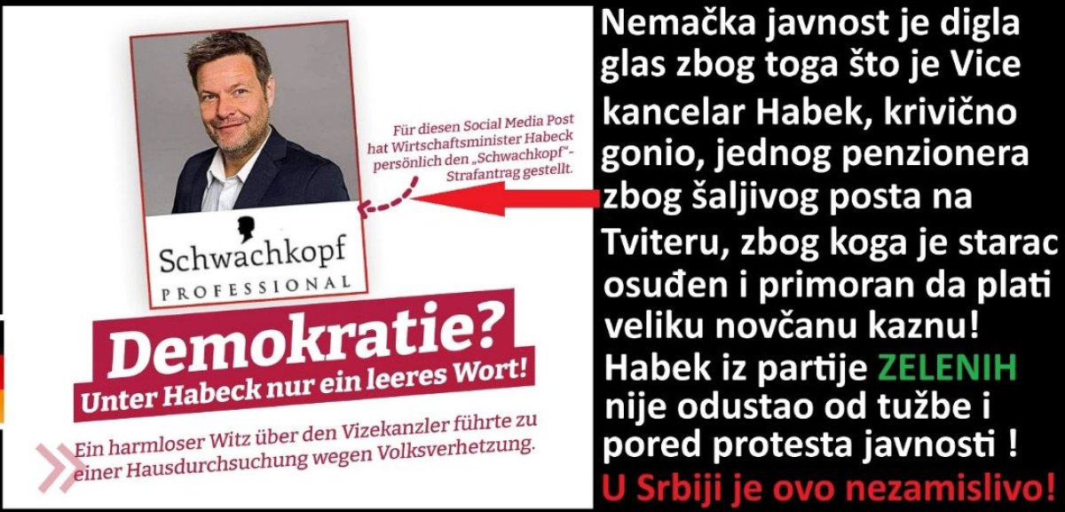 Evropska unija zatvara ljude zbog stavova na internetu! U mandatu Olafa Šolca, tj. stranaka SDP i Zelenih, funkcioneri ovih stranaka su podneli hiljade krivičnih prijava policiji, zbog kritika koju su im upućene preko interneta. Robert Habek, bivši potpredsednik Nemačke Vlade, je podneo preko 800 krivičnih prijava. Jedna od tih prijava je bila protiv penzionera, koji je tvitovao šaljivi post „Schwachkopf Professional” (grubi prevod: profesionalni idiot), uz Habekovu fotografiju. Policija je u 6 ujutru upala u dom penzionera, konfiskovala mu Ajped, i podnela krivičnu prijavu.