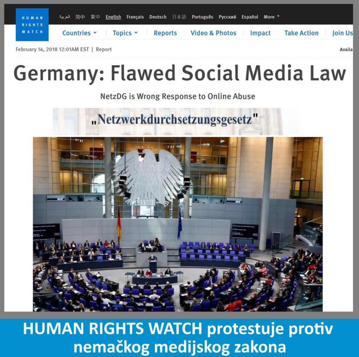 Niz novih zakona je usvojen u EU, koji ograničavaju slobodu govora. U Nemačkoj je donet zakon rogobatnog naziva „Netzwerkdurchsetzungsgesetz“, u prevodu „Prisilno nametanje akta koji se odnosi na mreže“, koji nameće cenzuru na društvenim mrežama, i predviđa drakonske kazne. Na kraju mandata, odlazeća vlast SDP-Zeleni, je izmenila i Krivični zakonik Nemačke, Član 188., koji predviđa posebnu zaštitu političara. Taj član zakona predviđa da bilo ko, ko iznosi kritiku protiv političara, koju ne može da dokaže i potkrepi, može biti kažnjen zatvorom do 3 godine. Nemački političari su onda nagrnuli da zahtevaju od policije da goni te građane.