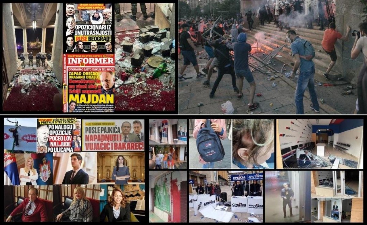 Nasilje koje generišu blokaderi i opozicija, eskalira od 2018. godine. Od tog trenutka, drastično je povećano nasilje nad pripadnicima SNS, pre svega ženama, i dogodilo se mnoštvo napada opozicije na institucije. Od 2018. višestruko je skočio broj napada na prostorije SNS. Od 2018. opozicija je napala, razlupala, i uništila više od 90 prostorija SNS. Ukupan broj napada opozicije na prostorije SNS je preko 160. Mnoge prostorije SNS su razbijane više puta. Prednjače napadi na prostorije SNS u Novom Sadu. Napadnute su prostorije SNS u sledećim gradovima ili opštinama: 03.06.2025. Novi Sad, 02.06.2025 Novi Sad, 19.05.2025 Novi Sad, 21.4.2025. Nova Varoš, 28.3.2025. Novi Sad, 14.03.2025. Alibunar, 09.03.2025. Novi Beograd, 24.1.2025. Ulica Sime Igumanova na Vračaru, 23.1.2025. Kraljevo, 17.01.2025. Savski venac, 16.1.2025. Novi Sad, 16.1.2025. Blok 70 Novi Beograd, 26.12.2024 Čačak, 24.11.2024. Novi Sad, Podbara, 14. 2.2024. Topola, 10.11.2024. su napadnute prostorije u Kragujevcu, Novom Sadu, na Voždovcu i Novom Beogradu, 8.11.2024. Novi Beograd, Stara Bežanija, 5.11.2024. su napadnute prostorije u Novi Sadu, Veternik, Petrovaradin, Rumenačka i Stražilovska ulica, 5.11.2024. Zvezdara, 22.8.2024. Čukarica, 22.10.2024. Novi Sad, ulica Narodnog fronta, 17.08.2024 Kragujevac, 02.06.2024. Zemun, 28.04.2023 Novi Sad, Bulevar oslobođenja, 19.02.2023 Blok 70 Novi Beograd, 17.2.2023. Čukarička padina, 15.04.2022. Rakovica, 19.01.2022. Krnjača, 29.11.2021. Ledine Novi Beograd, 04.11.2021. Ilije Birčanina, Novi Sad, 29.09.2021. Novi Sad, 9.4.2021. Palilula, 12.03.2021. Mladenovac, 20.10.2020 Bač, 1.6.2020. Mladenovac, 29.4.2020. Zemun dva napada, 24.4.2020. Skadarska-Stari Grad, 06.01.2020 Novi sad, 25.4.2020. Beograd-Stari grad, Skadarska, 08.07.2020. Novi Sad-Stražilovska, 06.01.2020. Novi Sad, Centar 2, 09.07.2020. Čačak, 2020. Beograd, Vračar, 06.05.2020. Gložane, Bački Petrovac, 11.01.2020. Bački Petrovac, 10.09.2020. Beograd, Stari grad, Skadarska, 19.10.2020. Bač, 08.07.2020. Šabac, 01.06.2020. Beograd, Mladenovac, 13.02.2020. Bečej, 09.07.2020. Pančevo, 09.07.2020. Niš, 2019. Beograd-Zvezdara, 2019. Beograd-Čukarica-Železnik, Petrovaradin 2019., 23.12.2019. Beograd, Novi Beograd, Savski kej, 14.04.2018. Beograd, Rakovica, 02.12.2018. Požarevac, 31.12.2018. Sombor, 14.04.2018. Beograd, Rakovica, 20.01.2018. Sevojno, 18.01.2018. Beograd Lazarevac, 2017. Beograd, Zvezdara, 2017. Lajkovac, 31.03.2017. Kragujevac, 25.03.2017. Beograd, Voždovac, 26.04.2016. Ćuprija, 21.04.2016.Zrenjanin dva puta, 16.4.2016. Zrenjanin, 05.06.2015. Surdulica, 21.02.2014. Bečej, 25.11.2013. Smederevo itd.