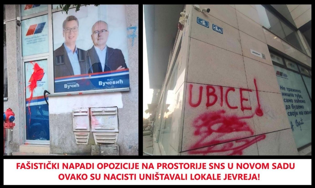 08.12.2023. u Jagodini su napadnuti aktivisti SNS, oko 12:30h u centru sela Ribara. Đilasovi huligani su pokušali da jednog aktivistu SNS pregaze autom, a pre toga su im pretili i vređali ih. 10.12.2023. su dva puta napadnute žene iz SNS u Kragujevcu! Prvi napad se dogodio oko podneva, kada je grupa đilasovaca, prošla pored štandova SNS, i pri tome psovala i vređala žene iz SNS. Drugi napad je usledio pola sata posle prvog, kada je veća grupa Đilasovih bandita, batinaša i huligana fizički nasrnula na žene iz SNS, i krenula da uništava štandove. Huligani su povredili vrat Valentini Matović, a jednoj ženi su su razbili telefon. Sa druge strane niko iz SNS nije napao bilo koga iz opozicije, i nije uzvraćao na nasilje opozicije. Jedini zuzetak je napad na jednu studentkinju u januaru 2025. Tokom 7 godina, napade na prostorije SNS, i na aktivistkinje, žene iz SNS, nisu osudili ni zaštitnik građana, ni poverenica za rodnu ravnopravnost, niko iz EU, niko iz OEBS. Ni jednom! Naravno, ove napade na žene iz SNS, nikada nije osudio bilo koji Đilasov ili Šolakov medij. Nikada! Nikada od opozicije niste čuli osudu nasilja koje potiče od njih. Krajnje nenormalno, Đilasovi i Šolakovi, tj. opozicioni mediji glorifikuju svoje nasilnike. Ovako kako opozicija napada prostorije SNS, žene iz SNS, a poslednjih meseci i studente koji žele da uče, tako su nacisti od 1933. godine, prvo napadali u uništavali lokale Jevreja. Posle toga su nacisti na ulicama prebijali Jevreje. Posle toga su Jevrejima zabranili da idu u škole i na fakultete. Kasnije im oduzeli svu imovinu, a konačno su nacisti počinili genocid nad Jevrejima.