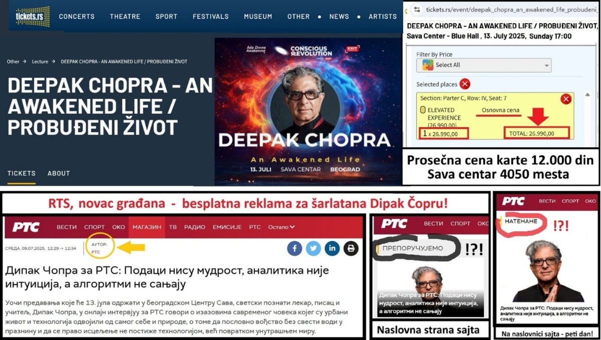 RTS je čak poslao i ekipu na koncert naciste Tompsona. Sramotan način da se troši novac građana koji finansiraju RTS. U svom zanosu nekontrolisanosti i neodgovornosti, RTS je 9.7.2025. na naslovnoj strani svog sajta, koji takođe plaćaju građani Srbije, objavio besplatnu reklamu megašarlatanu i prevarantu Dipak Čopri, u tekstu pod naslovom „Dipak Čopra za RTS: Podaci nisu mudrost, analitika nije intuicija, a algoritmi ne sanjaju". Autor teksta - onlajn (!?!) intervjua je „RTS"!?! Problem je u tome što je Dipak Čopra dokazani šarlatan i prevarant, koji se neizmerno obogatio prodajom svojih proizvoda i knjiga i držanjem predavanja o „taštini praznine"- o „kvantnoj medicini" koja nije nauka, već pseudo nauka, prevara koja služi da se šarlatani bogate zloupotrebljavajući neznanje, lakovernost i naivnost neupućenih. Dipaka Čopru dovodi štetočinska „EXIT fondacija" koja je deo tima „EXIT festivala", a „EXIT" je idiotski festival koji je nastao u doba vladavine DOS-a, i koji služi sluđivanju omladine i razobručenom bogaćenju onih koji ga organizuju. Dipak Čopra je autor 95 knjiga, prodatih u preko 20 miliona primeraka. Čopra je stekao enormno bogatstvo prodajući taštinu praznine. Sveukupni biznis Dipaka Čopre donosi oko 20 miliona dolara godišnje (prodaja knjiga, biljnih suplemenata, ulja, dvd-a, predavanja itd.). Pretpostavljam da bi mudri Ivo Andrić, ovako opisao Dipaka Čopru: „Dođe vakat kad pametni zaćute, budale progovore, a fukara se obogati". Prethodne dve decenije, Čopru su kritikovali i razobličavali mnogi naučnici. Najveći među njima je Ričard Dokins, britanski etolog, evolutivni biolog i naučno-popularni pisac. Dokins je profesor na Oksfordskom univerzitetu i šef katedre za razumevanje nauke u javnosti. Autor je izvanrednih naučnih dela - Sebični gen (1969), Uspon uz planinu neverovatnosti (1996), Priče naših predaka (2004), Zabluda o Bogu (2006), Najveća predstava na Zemlji (2009) itd.