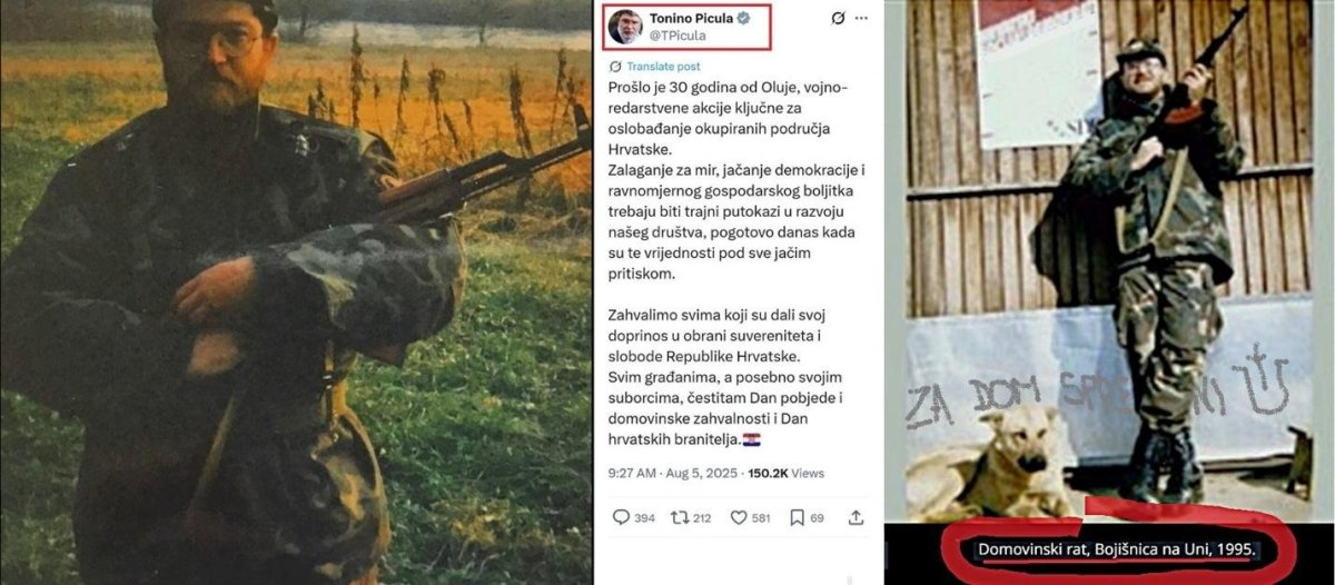 Na profilu evroposlanika Tonina Picule stoji njegova fotografija u uniformi, na kojoj se ne vide oznake jedinice, sa kalašnjikovim. Ispod fotografije Picula je stavio tekst „Domovinski rat, Bojišnica na Uni, 1995.“.
