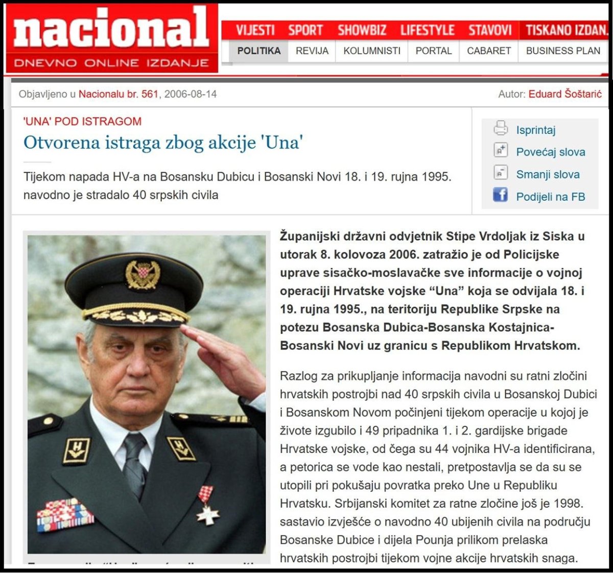 O zločinima nad srpskim civilima u zločinačkoj „Operaciji Una“ je pisao hrvatski list „Nacional“ u broju 561 od 14. avgusta 2006. godine, u tekstu pod naslovom: „Otvorena istraga zbog akcije 'Una'“. U tekstu stoji, između ostalog: „Tijekom napada HV-a na Bosansku Dubicu i Bosanski Novi 18. i 19. rujna 1995. navodno je stradalo 40 srpskih civila. Županijski državni odvjetnik Stipe Vrdoljak iz Siska u utorak 8. kolovoza 2006. zatražio je od Policijske uprave sisačko-moslavačke sve informacije o vojnoj operaciji Hrvatske vojske “Una” koja se odvijala 18. i 19. rujna 1995., na teritoriju Republike Srpske na potezu Bosanska Dubica-Bosanska Kostajnica-Bosanski Novi uz granicu s Republikom Hrvatskom. Razlog za prikupljanje informacija navodni su ratni zločini hrvatskih postrojbi nad 40 srpskih civila u Bosanskoj Dubici i Bosanskom Novom počinjeni tijekom operacije. Srbijanski komitet za ratne zločine još je 1998. sastavio izvješće o navodno 40 ubijenih civila na području Bosanske Dubice i dijela Pounja prilikom prelaska hrvatskih postrojbi tijekom vojne akcije hrvatskih snaga. Tijekom istrage bit će presudno utvrditi jesu li civilne žrtve ubijene iz neposredne blizine vatrenim ili hladnim oružjem, odnosno postoji li dokumentacija na temelju provedene obdukcije nad tijelima. Također, neke nevladine međunarodne organizacije koncem 90-ih posjećivale su obitelji civilnih žrtava i prikupljale informacije o okolnostima pogibije članova njihovih obitelji. Ovih dana, doznaje Nacional, srpska strana namjerava otvoriti pitanje hrvatskih ratnih zločina za vrijeme akcije "Una". Traže se video zapisi, svjedoci, prikuplja se dodatna dokumentacija, da bi se pokušalo dokazati da su pripadnici 1. bojne 2. gardijske brigade činili ratni zločin nad srpskim civilima u Bosanskoj Dubici. Procjenjuje se kako je u operaciji “Una” sudjelovalo 1500 hrvatskih vojnika iz sastava gardijskih brigada i još toliko iz dviju domobranskih pukovnija“.