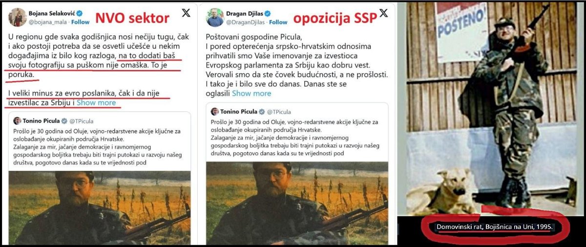 Lider SSP Dragan Đilas je na mreži "X" istakao sledeće: „Poštovani gospodine Picula, Danas ste se oglasili pohvalama za saborce u akciji Oluja, a uz pohvale ste okačili svoju fotografiju sa oružjem u rukama. Time ste kompromitovali funkciju izaslanika Evropskog parlamenta za Srbiju, jer ne može se biti izaslanik sa automatskom puškom u ruci. Vi znate da je po izveštaju hrvatskih nevladinih organizacija u akciji "Oluja" koju hvalite, ubijeno preko 1.100 srpskih civila, da je uz to proterano više od 200.000 ljudi. U sklopu te akcije nazvane „Oluja“, opljačkano je i spaljeno hiljade i hiljade kuća, kako se u njih niko nikada ne bi mogao vratiti. Među tim spaljenim kućama bila je i kuća mojih pokojnih babe i dede u selu Očigrije. I najgore od svega, tokom "Oluje" na ljude koji su bežali u kolonama, na decu, žene i starce, neki Vaš saborac pucao je iz aviona. Tu veliku ideju o Srbiji u jedinstvenoj, demokratskoj, slobodnoj Evropi nisu ubili ni rafali na Petrovačkoj cesti, ni bombe koje su padale na glave svih nas, pa nećete ni Vi objavom koja nije u duhu socijaldemokratskih i evropskih vrednosti...“. Koordinatorka Nacionalnog konventa o Evropskoj uniji Bojana Selaković, na društvenoj mreži "X" komentarisala je fotografiju na kojoj Tonini Picula u vojničkoj uniformi pozira sa automatskom puškom, a koju je objavio na pomenutnoj mreži povodom 30 godina od akcije "Oluja". Bojana Selaković kaže: „U regionu gde svaka godišnjica nosi nečiju tugu, čak i ako postoji potreba da se osvetli učešće u nekim događajima iz bilo kog razloga, na to dodati baš svoju fotografiju sa puškom nije omaška. To je poruka. I veliki minus za evro poslanika, čak i da nije izvestilac za Srbiju i čak i da ne pripada grupaciji evropskih socijal-demokrata“.