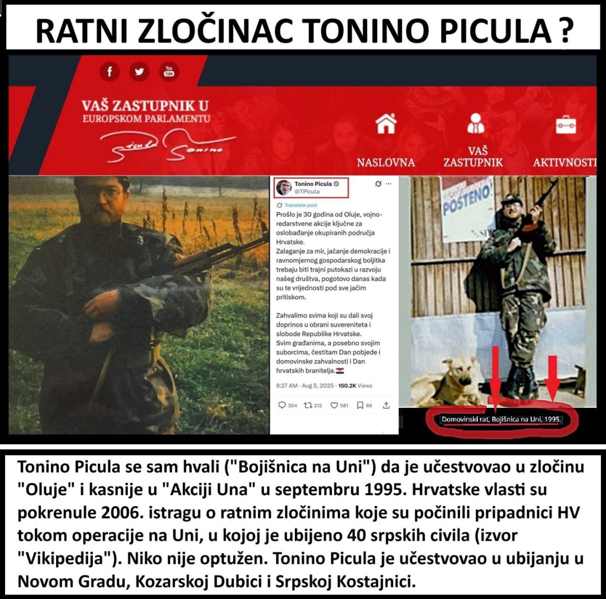 Logično bi bilo da se oglase Evropska komisija i Evropski parlament, i da uklone Piculu sa svih funkcija. Picula se pohvalio učešćem u u zločinačkoj akciji „Oluja“ u avgustu 1995., u kojoj je ubijeno oko 2500 Srba, i proterano 250.000 Srba, građana Hrvatske. Tonino Picula se pohvalio i učešćem u zločinačkom napadu HV (Hrvatske vojske) na Republiku Srpsku u septembru 1995. poznatom kao „Operacija Una“, za koju hrvatski izvori priznaju da je u njoj ubijeno 40 srpskih civila. Logično je zaključiti da postoji velika verovatnoća da je u ta tri meseca 1995. godine, Tonino Picula učestvovao u etničkom čišćenju, progonu i ubijanju srpskih civila. Postoji velika verovatnoća da je Tonino Picula, ratni zločinac!