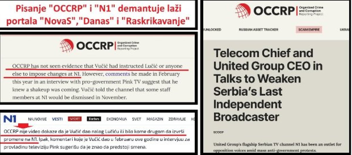 Sva četiri medija „N1“, „NovaS“, „Danas“ i „Raskrikavanje“ se pozivaju na vest na portalu „OCCRP“. Tu glavnu laž, uopšte ne pominje portal „N1“, niti osnovni izvor vesti, a to je portal „OCCRP“. U tekstu na portalu „OCCRP“, koji je objavljen samo na engleskom jeziku, pod naslovom „Telecom Chief and United Group CEO in Talks to Weaken Serbia’s Last Independent Broadcaster“ - jasno stoji da se predsednik Vučić nije mešao u promene u Junajted grupi, Junajted mediji ili na TVN1. U tekstu na portalu „OCCRP“, jasno stoji sledeće: „OCCRP has not seen evidence that Vučić had instructed Lučić or anyone else to impose changes at N1“ („OCCRP nije video dokaz da je Vučić naložio Lučiću ili bilo kome drugom da nametne promene na N1“).