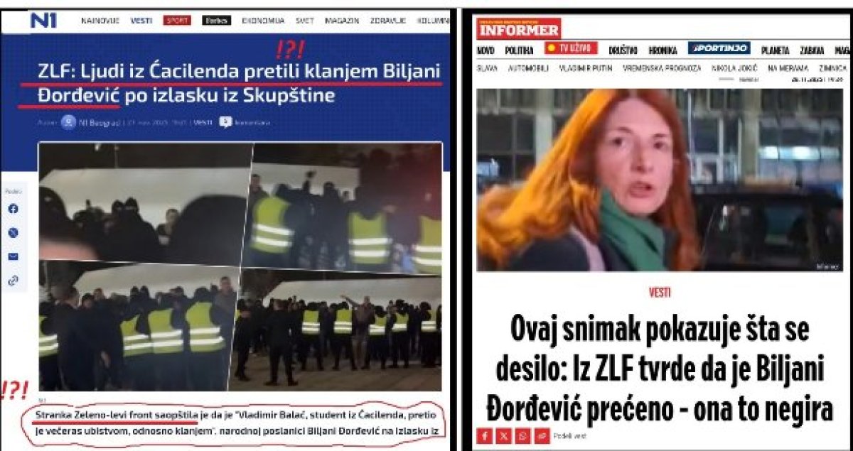 Ta lažna vest jer zasnovana na laži stranke ZLF koja je saopštila neistinu i potpunu izmišljotinu da je „Vladimir Balać, student iz Ćacilenda, pretio ubistvom, odnosno klanjem, narodnoj poslanici Biljani Đorđević na izlasku iz Narodne skupštine“. U pitanju je spin opozicije. Opet su zavrteli u svojim medijima izmišljeni događaj. Ova lažna vest je namerno lansirana, kao što su ranije lansirane lažne vesti koje su objavili opozicija i N1 i NovaS. Tako su opozicija i N1 i NovaS, 16.08.2025. lansirali lažnu vest da je policija pretukla i ubila dečaka u Valjevu. Vest je potpuna laž – nije se dogodilo – izmislili su. Opozicija i N1 i NovaS su 15.8.2025. lansirali laž – na N1 lažna vest je objavljena pod naslovom: „Studentkinja: Marko Kričak mi pretio da će me silovati, šamarao i udarao mi glavu o zid“. Vest je potpuna laž – nije se dogodilo – izmislili su. Opozicija i N1 i NovaS su 14.10.2025. preneli lažnu vest da je policija kidnapovala, mučila i pretukla studentkinju Anju Pušković. Anja Pušković je to demantovala. Vest je potpuna laž – nije se dogodilo – izmislili su.
