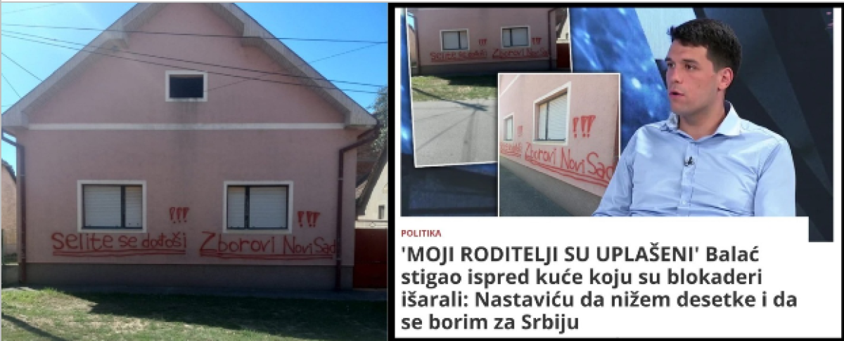 Kada govorimo o sjajnom studentu završne godine FTN u Novom Sadu, Vladi Balaću, setimo se da su opozicija i blokaderi teroristi 26.08.2025. godine, zastrašujućim pretećim grafitima („Selite se dođoši“, u potpisu „Zborovi Novi Sad“), unakazili porodičnu kuću Vladimira Balaća i njegovih roditelja u Futogu. Napadači su znali da je Balaćeva porodica preživela pakao u Grahovu 1995. godine. Tada su im ustaše spalile kuću, a u avgustu su doživeli da im blokaderi na srpskom tlu čine podjednako zlo. To je fašizam opozicije na delu. Vladimir Balać i njegova porodica su kontinuirano meta napada opozicije, iz dva razloga: prvi – zato što Vladimir želi da studira i ne plaši se da to imenom i prezimenom kaže, i drugi – zato što je njegova porodica iz Bosanskog Grahova.