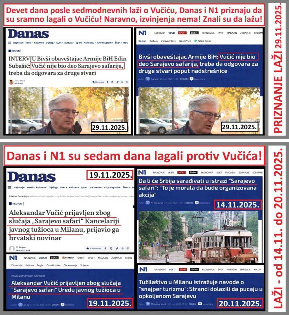 Devet dana posle sedmodnevnog laganja i dehumanizovanja predsednika Vučića, N1 i Danas, 29.11.2025., objavljuju da predsednik Vučić nije imao veze sa "safarijem u Sarajevu" (naslovi - N1:"Bivši obaveštajac Armije BiH: Vučić nije bio deo Sarajevo safarija, treba da odgovara za druge stvari poput nadstrešnice", i Danas:"INTERVJU Bivši obaveštajac Armije BiH Edin Subašić: Vučić nije bio deo Sarajevo safarija, treba da odgovara za druge stvari") čime priznaju da su devet dana pre toga, tokom sedam dana, bezumno i sramno lagali. Naravno, nema izvinjenja predsedniku Vučiću, nema saopštenja urednika ili redakcija, u kome kažu - od 14.11. do 20.11.2025. objavljivali smo lažne vesti o umešanosti predsednika Aleksandra Vučića u safarije na ljude u ratnom Sarajevu. Svakako, bilo bi previše od njih očekivati i da priznaju da safariji na ljude u ratnom Sarajevu, koje su organizovali Srbi, nisu postojali.
