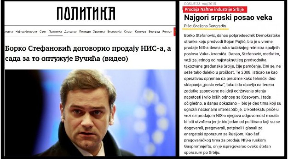 Borko Stefanović je sada potpredsednik SSP. Glavni pregovarač za kriminalnu prodaju NIS-a je bio Borko Stefanović! O poklanjanju NIS-a Rusima 2008., pisala je Snežana Čongradin - sada poznata novinarka opozicionog lista „Danas“: „Borko Stefanović je u vreme prodaje NIS-a bio desna ruka tadašnjeg ministra spoljnih poslova Vuka Jeremića. I tada očigledno, a danas dokazano – bio je deo tima koji su ugrozili nacionalni interes Srbije. U kontekstu priče u vezi sa prodajom NIS-a njegova odgovornost morala bi biti utvrđena jer je bio jedan od političara koji su se dogovarali, pregovarali, potpisali i glasali za energetski sporazum sa Rusijom. Kao šef pregovaračkog tima za prodaju NIS-a ruskom Gaspromnjeftu, on je ispregovarao ovako štetan sporazum po Srbiju“. NIS je prodat za samo 400 miliona evra, odnosno po 5 puta nižoj ceni, od tržišne. Borko Stefanović je 2008. godine, bio šef tehničkog pregovaračkog tima za prodaju NIS-a. Borko Stefanović, je kao glavni pregovarač za prodaju NIS, usvojio Đilasovu sugestiju, pa je Borko Stefanović, glavni pregovarač, predoložio vladi, a Vlada Mirka Cvetkovića i Tadića, prihvatila, da se od Rusije ne traže garancije da će biti izgrađen gasovod Južni tok. Južni tok nije izgrađen.