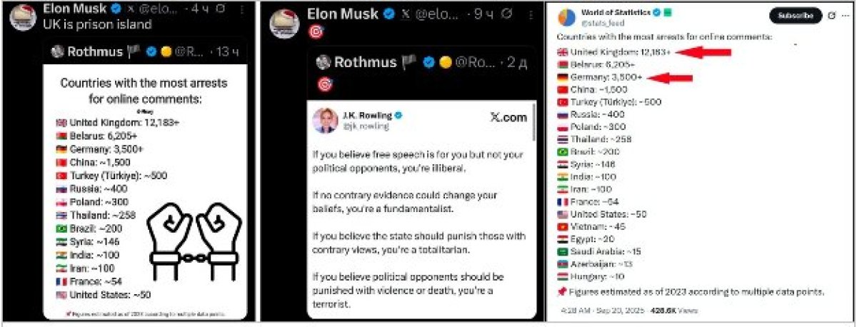O medijskim slobodama i vladavini prava (a to EU zamera Srbiji), u EU i u zapadnoj Evropi, svedoči sledeće. To govori o licemerju i dvostrukim aršinima EU. Savet EU, EU komisija i EU Parlament nikada ne raspravljaju, i ne pišu izveštaje, o odsustvu vladavine prava, o gušenju medijskih sloboda i javne reči u zemljama EU, poput Nemačke ili u ostalim evrozemljama zapada, poput Velike Britanije. Ilon Mask je pre neki dan objavio tabelu evropskih zemalja sa najviše (nedemokratskih i totalitarnih) hapšenja zbog onlajn komentara građana. Podaci su za 2023. god. Na prvom mestu je Velika Britanija sa 12.183 hapšenja građana, po prijavama vlastodržaca. Druga je Belorusija sa 6205 prijava, a treća je članica EU - Nemačka sa 3500 prijava vlastodržaca protiv običnih građana. U 2024. i 2025. broj prijava se višestruko povećao.