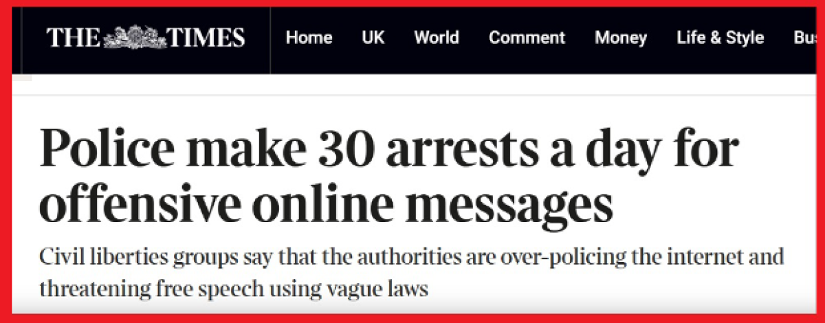 U Velikoj Britaniji slična pojava ima mnogo veće i ozbiljnije razmere nego u Nemačkoj. Broj prijava protiv građana je četiri puta veći nego u Nemačkoj i u 2023. godini broj hapšenja zbog onlajn komentara u Velikoj Britaniji iznosi 12.183 ili 33 dnevno. To su podaci iz lista „Tajms“ („The Times“). Ova neopravdana i represija Policija hapsi ljude u Britaniji, po osnovu nedemokratskog i totalitarnog zakona „Communications Act“ i još goreg zakona „Malicious Communications Act“. List „Gardijan“ je 29.01.2025. objavio tekst u kome navodi da je šest policajaca došlo na vrata Maksi Alena i njegove supruge Rozalind Livajn, u Hertfordšajru. Posle kratkog razgovora sa ovim sredovečnim parom, pred njihovim školskim detetom, policija ih je uhapsila. Optuženi su za „zloćudnu komunikaciju“. Suština optužbi je zapanjujuća. Njih dvoje su prigovarali izboru direktora osnovne škole, na Vocap roditeljskoj grupi. To se nije svidelo rukovodstvu škole, koje ih je prijavilo policiji, pa je pola tuceta policajaca došlo i uhapsilo ih! Ovakvo masovno postupanje eskalira u doba vlasti premijera Starmera.
