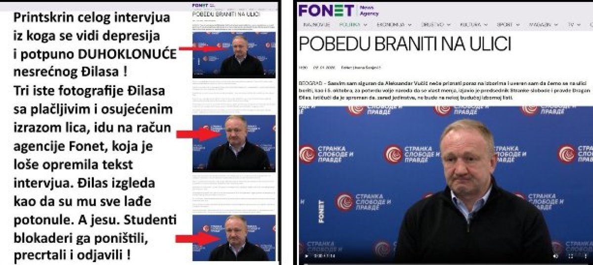 Fonet je, kad otvorite intervju, prikazao 3 iste Đilasove slike (početak svakog video snimka) koje pokazuju potpuno Đilasovo duhoklonuće. Sva tri video snimka su mračna, depresivna, a Đilas izgleda kao da su ga krave žvakale, crven, sa višestrukim podočnjacima, izboran, izgužvanog lica. Govor tela odražava poraženog čoveka. Uobičajeno, vidi se da Đilas ne živi u stvarnosti, već u svom virtuelnom balonu, u kome halucinira jednako kao i blokaderi sa „studentske liste“ koji su ga ponizili, poništili, ugasili i odjavili.