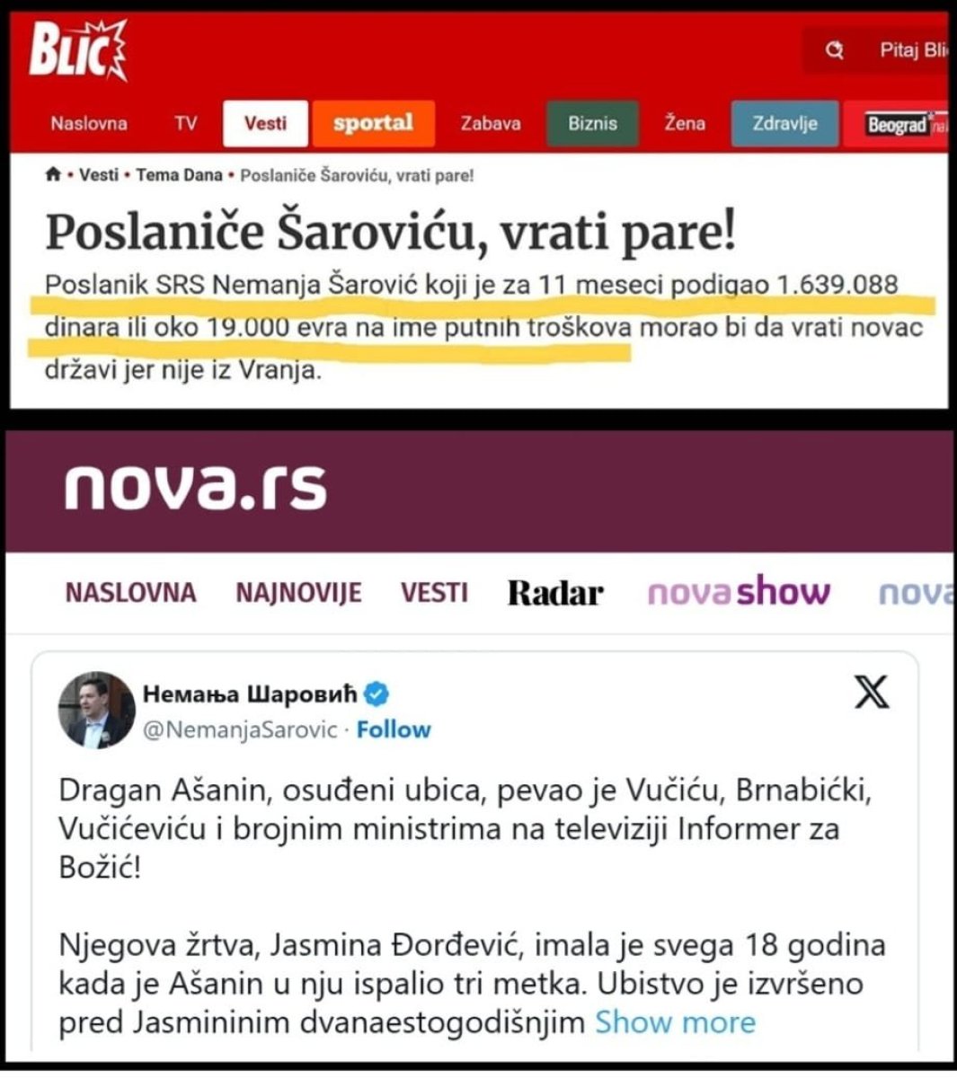 Navešću samo dva podatka, dve vesti iz medija koje jasno govore o krivičnim delima Nemanje Šarovića. Prva je vest lista „Blic“ od 24.12.2005. pod naslovom „Poslaniče Šaroviću, vrati pare!“ u kojoj se navodi da je poslanik Nemanja Šarović „uzeo“ tj. otuđio 1.639.088 dinara – 19.000 evra na ime lažnih putnih troškova! „Blic“ je tvrdio da Šarović mora da vrati novac državi jer nije iz Vranja. „Blic“ je navodio da je Šarović lažno prijavljivao da svakog dana putuje u Vranje, iako živi u Beogradu (Šarović je tada bio odbornik u opštini Stari grad)! O ovom slučaju su 2005. godine, pisali i drugi mediji. Zbog čega propala NovaS, propali Šarović i propali ustaški mediji, ne pišu o ovom slučaju krađe iz 2005. godine, od pre 21 godinu, o pljački koju je počinio njihov miljenik? Isti aršini moraju da važe i za miljenika propale NoveS, propalog Nemanju Šarovića i za D. Ašanina.
