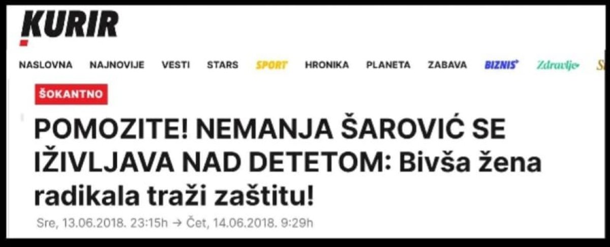 Druga vest je informacija lista „Kurir“ od 13.06.2018., pod naslovom „POMOZITE! NEMANJA ŠAROVIĆ SE IŽIVLJAVA NAD DETETOM: Bivša žena radikala traži zaštitu!“ u kojoj se navodi da je bivši poslanik Nemanja Šarović mogao da ugrozi zdravlje sinu V.Š.(6) pošto je odbijao da da saglasnost da se dečak operiše, zbog svađe sa majkom deteta Aleksandrom Ilić, navodi se u nalazu Centra za socijalni rad. Tu vest su preneli i drugi mediji, npr. list „Alo“ pod naslovom „Nemanju Šarovića bivša supruga prijavila zbog ugrožavanja deteta“ i list „Novosti“ pod naslovom „LICEMERJE NEMANJE ŠAROVIĆA: Potplaćivao radnika za socijalni rad kako bi pisao izveštaj u njegovu korist“. Zbog čega propala NovaS, propali Šarović i propali ustaški mediji, ne pišu o ovom slučaju porodičnog nasilja iz 2016. godine, od pre 10 godina, o porodičnom nasilju koje je počinio njihov miljenik? Isti aršini moraju da važe i za miljenika propale NoveS, propalog Nemanju Šarovića i za D. Ašanina.