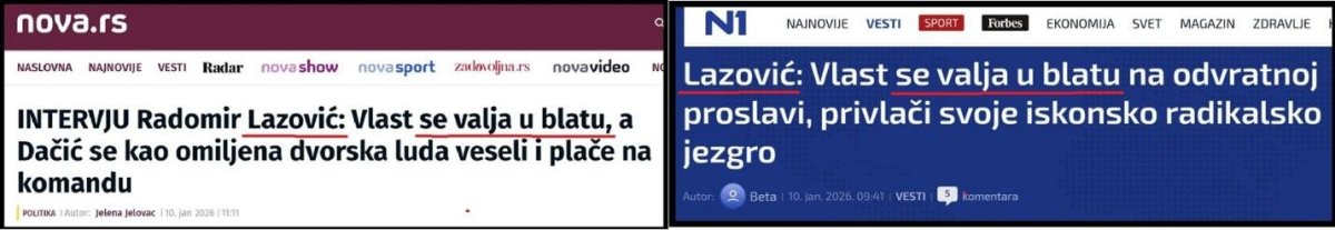 Večiti student Radomir Lazović kaže: „Vučić je toliko duboko i očigledno u kriminalu“. Krajnje je neverovatno da se nasilnik Lazović, počinilac niza krivičnih dela usuđuje da svoje grehe prebacuje Vučiću. Lazović je tokom nasilja u Skupštini 4.3.2025. počinio niz krivičnih dela. Bacao je dimne bombe i suzavac, ispraznio je protivpožarni aparat sa otrovnim sadržajem, fizički je napadao poslanice iz SNS. Lazović je doprineo povređivanju poslanice SNS, Jasmine Obradović, koja je dobila moždani udar, i Sonje Ilić, u osmom mesecu trudnoće, ugrozivši i njen život i život njenog nerođenog deteta.