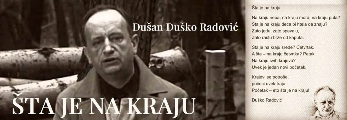 Motiv koji provlačim kroz ovaj tekst je divna pesma Duška Radovića „Šta je na kraju“- „Šta je na kraju, na kraju neba, na kraju mora, na kraju puta? Šta je na kraju, deca bi htela da znaju? Zato jedu, zato spavaju, zato rastu brže od kaputa. Šta je na kraju srede? Četvrtak! A šta – na kraju četvrtka? Petak! Na kraju svih krajeva, uvek je jedan novi početak. Krajevi se potroše, počeci uvek traju. Početak – eto šta je na kraju!“.