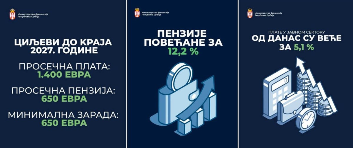 Od januara se isplaćuju penzije uvećane za 12,2 odsto. Prosečna penzija u Srbiji krajem 2025. je iznosila 437 evra, dok se u 2026. godini očekuje da će iznositi 490 evra. Planom „Skok u budućnost“ predviđeno je da krajem 2027. godine prosečna penzija bude 650 evra. 2012. godine u vreme kada je na vlasti bila sadašnja opozicija, prosečna penzija je iznosila sramnih 204 evra. Predsednik Vučić je 30.12.2025. rekao: „Čestitam penzionerima, oni će za 5 dana dobiti najveće penzije u svojoj istoriji. One su nominalno uvećane 137 posto od 2016. godine. A realno uvećanje je 44,8 posto. To je realno povećanje životnog standarda. I nećemo tu stati! To je jedna od stvari zašto sam rekao - najbolja godina, i za naše penzionere koji će opet imati značajno povećanje penzija na ovih 12,2 odsto. Neće povećanje penzija u 2026. biti 2,3,4 ili 5 odsto, biće znatno preko toga. Da penzioneri ne misle da je ovo kraj, dolazi dodatno značajno povećanje penzija".