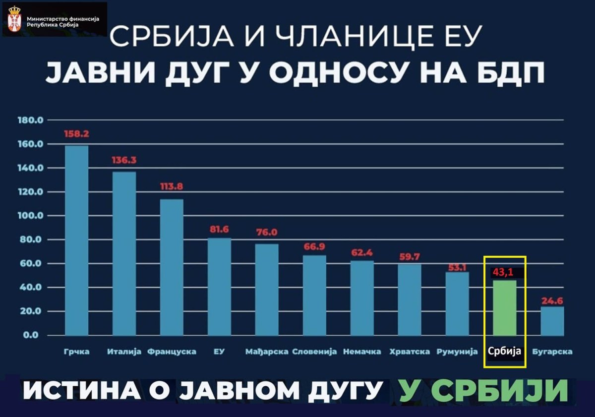 Opozicija se zbog našeg niskog javnog duga, najčešće služi obmanama kada govori samo o apsolutnom iznosu javnog duga – koji je sekundarna i ne previše bitna stvar. Opozicija govori primitivnu neistinu da je Srbija prezadužena. Važan i istinit je samo odnos javnog duga prema BDP-u, jer jedino taj podatak govori o održivosti javnih finansija, zbog toga što pokazuje koliki je dug u odnosu na kapacitet zemlje da ga servisira. Jedino odnos javnog duga prema BDP-u pokazuje snagu i veličinu srpske ekonomije. A taj odnos je izvanredan. Najbolja potvrda za to je i investicioni kreditni rejting koji je Republika Srbija dobila po prvi put u istoriji.
