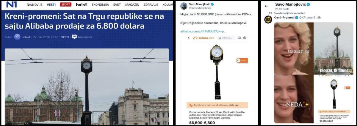 Tako je juče, 22.2.2026. AlibabaSava Manojlović, lider Kreni Promeni, lansirao detinjastu laž da novi simbol Beograda, „Beogradski sat“ može da se kupi na sajtu „Alibaba“ za 6800 dolara.