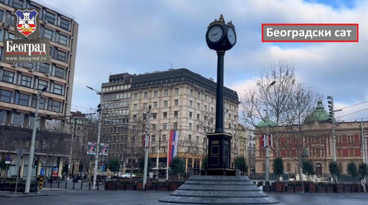 Da podsetim, takođe juče, je na kružnom toku na Trgu republike postavljen novi Beogradski sat. U pitanju je novi simbol Beograda. Beogradski sat je visok devet metara (2 metra postamenta i 7 metara sata sa stubom) i težak je sedam i po tona (sa postamentom). Sat ima kvalitetni francuski mehanizam kupljen od renomirane francuske kompanije "Bode" (Bodet), koji radi na struju i samostalno podešava vreme preko sistema GPS za letnje i zimsko računanje vremena. Sat precizno pokazuje vreme, bez potrebe za ručnim podešavanjem i uvek će pokazivati tačno vreme. Konstrukcija (stub) sata je čelična, a oko stuba se nalazi oplata od livenog mesinga, što garantuje izuzetno dug, neograničen vek trajanja. Sat poseduje i unutrašnje i spoljno osvetljenje. Stub sata je izlila i konstruisala renomirana „Livnica Jeremić“.