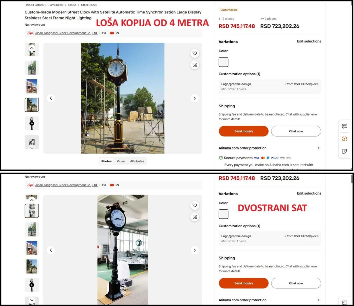 Kada uđete na link ka Alibabi koji nudi AliSava Manojlović, vidite o kakvoj prevari Manojlovića se radi. Decenijama je poznato da Kinezi prave kopije svega i svačega. U ovom slučaju Kinezi na Alibabi nude jeftine kopije francuskih uličnih satova. Kada pogladate tehničke specifikacije satova na linku koji daje Manojlović, vidi se ključni podatak – kineski satovi se proizvode u veličini-visini od 1 metar do 10 metara. Cena koju prikazuje Manojlović se odnosi na najjeftiniju varijantu sata – sat visok 1 metar, dvostran, a ne četvorostran, sa kineskim mehanizmom. Lepo stoji na Alibabi da se satovi rade u mnogo varijanti, po narudžbi i po želji, različitih visina, različitog broja strana, i od raznih materijala. Drugo, cena za sat slične veličine kao Beogradski sat, ali bez postamenta, je 10 puta veća od 6.600 dolara. Ta cena biva još veća ako kupac odabere četvorostrani, a ne dvostrani sat. Potom cena raste, ako odaberete čelik i oblogu od mesinga, koju Kinezi i nemaju, kao što ne nude izgradnju postamenta. I opet, ako naručite sat od 7 metara, dobijate loš i nebezbedan proizvod.