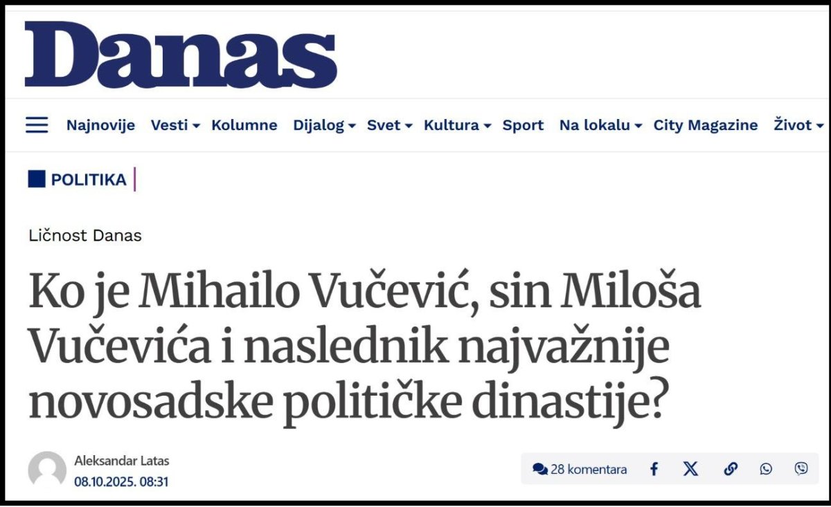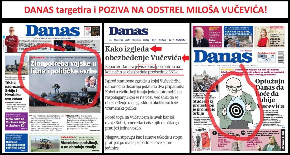 List „Danas“ je 12.3.2026. objavio sraman tekst pod naslovom: „Zašto Miloša Vučevića još uvek obezbeđuju Kobre?“. U tom tekstu list „Danas“ poziva da se Milošu Vučeviću ukine obezbeđenje, i to baš na dan obeležavanja godišnjice atentata na Zorana Đinđića. U tekstu „Danasa“ se vrši priprema za odstrel Miloša Vučevića, objavljivanjem strukture obezbeđenja, njihovih rutina i navika, bezbednosnih protokola štićenih lica - Miloša Vučevića i članova njegove porodice. To se zove prikupljanje podataka o meti i logistička priprema odstrela. U tekstu „Danasa“ je objavljena i fotografija zgrade u kojoj stanuje Miloš Vučević sa porodicom, uz naznaku da postoje ulične kamere, koje su takođe prikazane. Verovatno je list „Danas“ želeo da upozori buduće atentatore da postoje kamere. U tom sramnom tekstu „Danasa“ stoji: „Odred specijalne jedinice vojne policije Kobre i dalje obezbeđuje Miloša Vučevića iako mu je mandat premijera prestao pre deset meseci, a što nije u potpunosti u skladu sa Zakonom o Vojsci kao i uredbama. Pored samog Vučevića, Kobre obezbeđuju i njegovu celu porodicu, odnosno suprugu i njegova dva sina. Kako izgleda obezbeđenje Vučevića? Reporter Danasa je više dana posmatrao na koji način se obezbeđuje predsednik SNS-a. Ispred stambene zgrade u kojoj Vučević živi danonoćno dežuraju jedan do dva pripadnika Kobri u civilu, koji imaju jedan automobil na raspolaganju koji se ne vozi, već služi da se obezbeđenje u njega skloni ukoliko su loše vremenske prilike. Pored toga, sa Vučevićem je uvek bar još dvoje Kobri, a neretko i više njih ukoliko ga prati još jedno vozilo. Njegovu suprugu kao i sinove takođe u stopu prati još po dvoje pripadnika ove elitne jedinice. Za potrebe Vučevićevog obezbeđenja, preko puta njegove zgrade je instalirana kamera na visokom stubu koja snima širi radijus oko zgrade. Osim neposrednog obezbeđenja, još dvoje vojnih lica svakodnevno vrše antidiverzioni pregled tako što jedan vodi psa koji je dresiran da njuši eksploziv, dok drugi pripadnik Kobri ide iza sa malim ogledalom koje zavlači pod svaki parkirani automobil u radijusu od 200 metara od Vučevićeve zgrade. Ovaj pregled se radi nekada i više puta u toku dana, odnosno svaki put kada Vučević treba da napusti stan. Od samih izvora iz vojske, Danas je došao do saznanja da je za potrebe stanovanja pripadnika Kobri iznajmljen jedan stan koji se nalazi nekoliko ulaza pored Vučevićevog“. Kao što vidite „Danas“ je objavio desetak podataka koji bi mogli biti od koristi izvršiocima napada na Miloša Vučevića i njegovu porodicu.