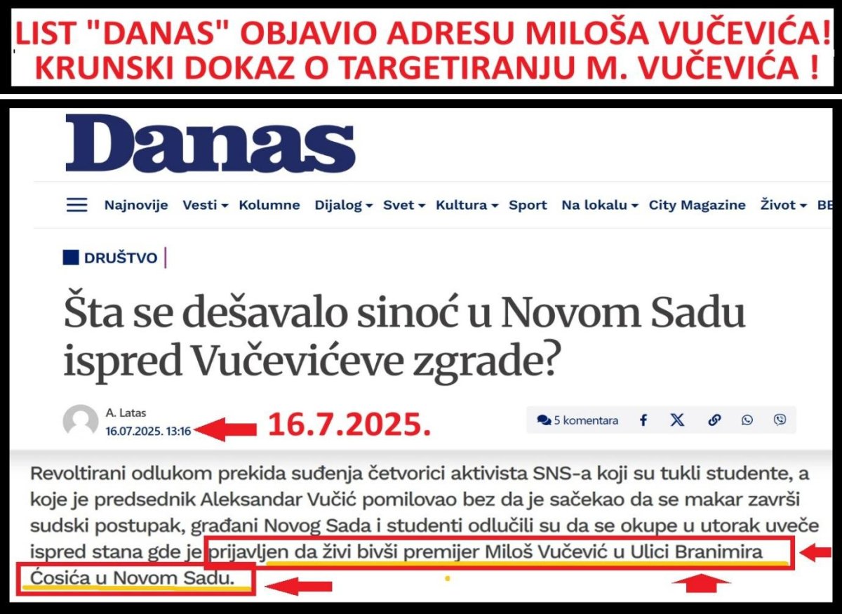List „Danas“ je 16.7.2025. u tekstu pod naslovom: „Šta se dešavalo sinoć u Novom Sadu ispred Vučevićeve zgrade?“, autora A. Latasa, objavio adresu, fotografije i video zgrade u kojoj stanuje Miloš Vučević sa porodicom. U uvodu tog teksta stoji: „građani Novog Sada i studenti odlučili su da se okupe u utorak uveče ispred stana gde je prijavljen da živi bivši premijer Miloš Vučević u Ulici Branimira Ćosića u Novom Sadu“. Time je N1 targetirao Miloša Vučevića i njegovu porodicu. Tekst „Danasa“ promoviše i hvali fašistički skup ispred stana porodice Miloša Vučevića i u tekstu „Danasa“ još stoji i sledeći sramni tekst: „okupljeni su skandirali, duvali u pištaljke i pravili buku. Skandiralo se „Vučeviću budi se“, „ruke su vam krvave“; „robija“, ali i „Vučeviću ološe“. Građani sa druge strane najavljuju nastavak ove igre, problem im je jedino kako napominju to što su naprednjaci za ovih 13 godina na vlasti od obično jednog stana u kojem su pre toga živeli, u imovinskim kartama nadodali barem još po nekoliko, pa ne znaju gde ih tačno pronaći. Možda je u tome i smisao igre“. Zbog ovoga je neophodno da Miloš Vučević bude štićena ličnost.